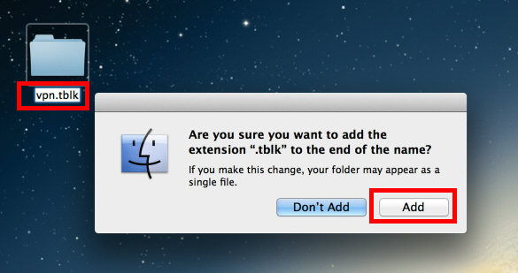 下一步,重命名桌面上 "Empty Tunnelblick VPN Configuration" 文件夹为 "anyname.tblk" 。("anyname"的部分可以变化。) 重命名后,你必须指定后缀 ".tblk" 。